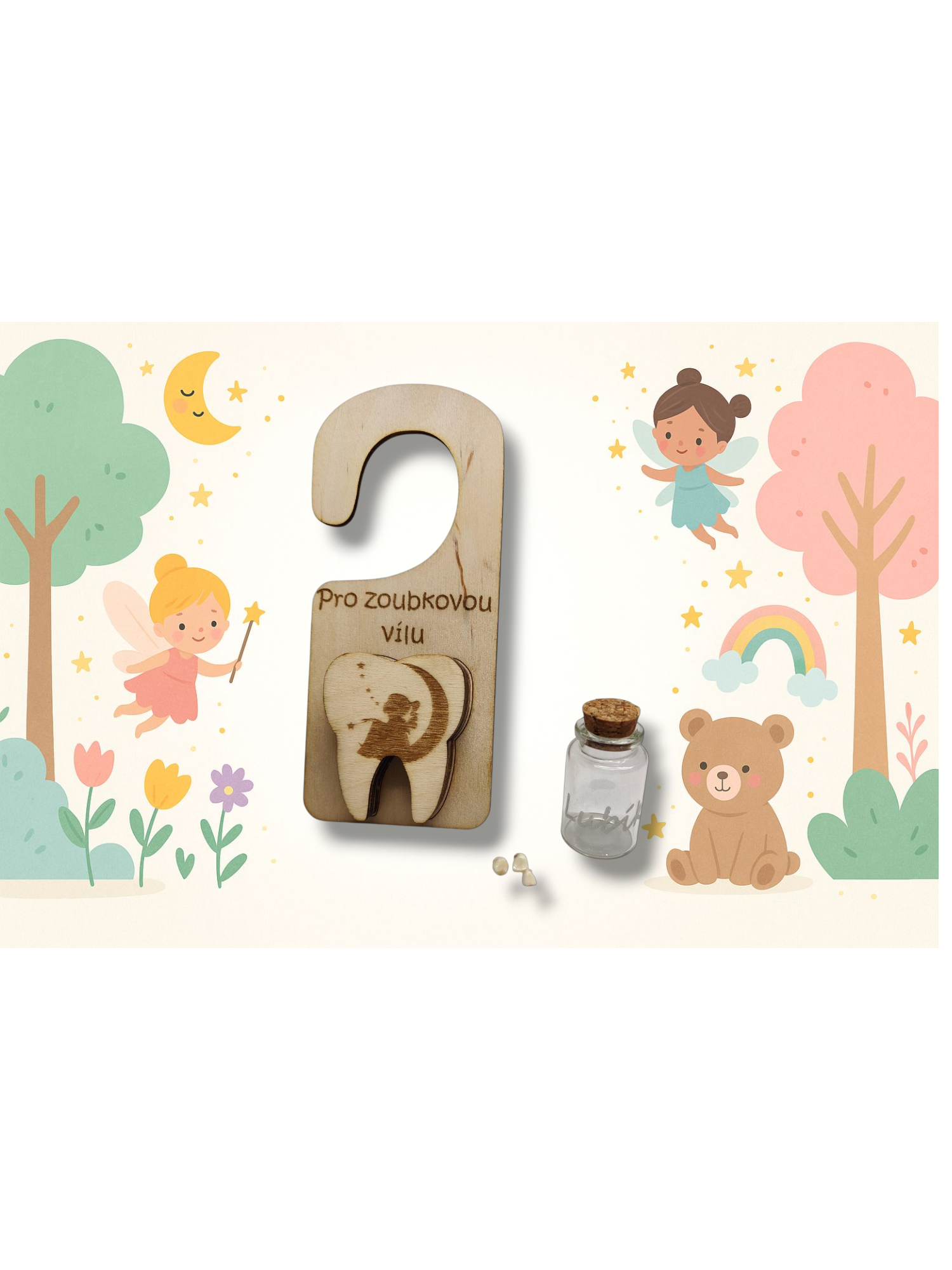 Proměňte každý vypadlý zoubek v kouzelný zážitek! Tento roztomilý dřevěný vešáček na kliku je ideální pro chvíle, kdy si váš drobeček večer schová zoubek pro zoubkovou vílu – a vy jej můžete pohodlně a nenápadně vyměnit za malou odměnu.