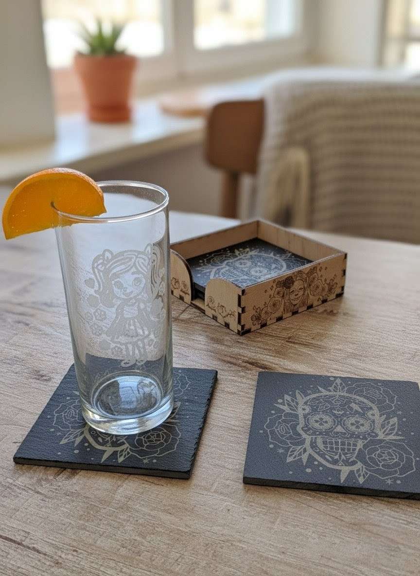 Laserem gravírované podtácky z břidlice + dřevěná krabička
