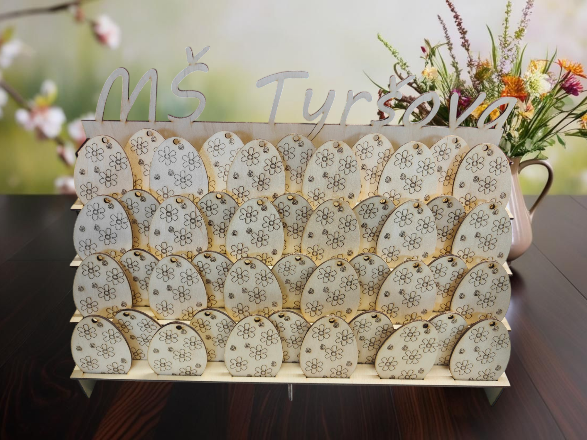 Velký dřevěný stojánek na 45 vajíček s možností vlastního textu a sadou 45 gravírovaných vajíček k dotvoření. Skvělé pro školky i velikonoční nadšence!