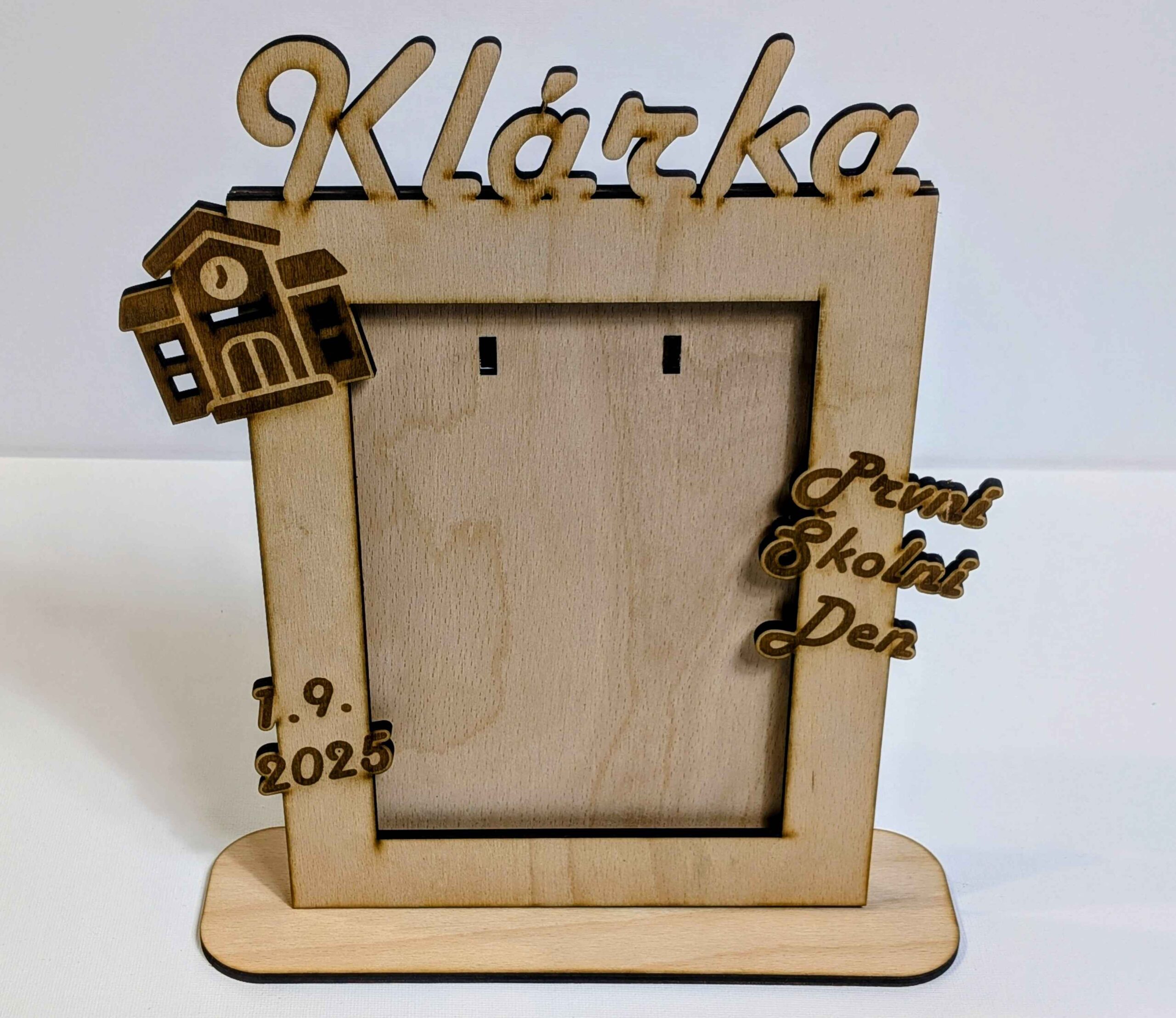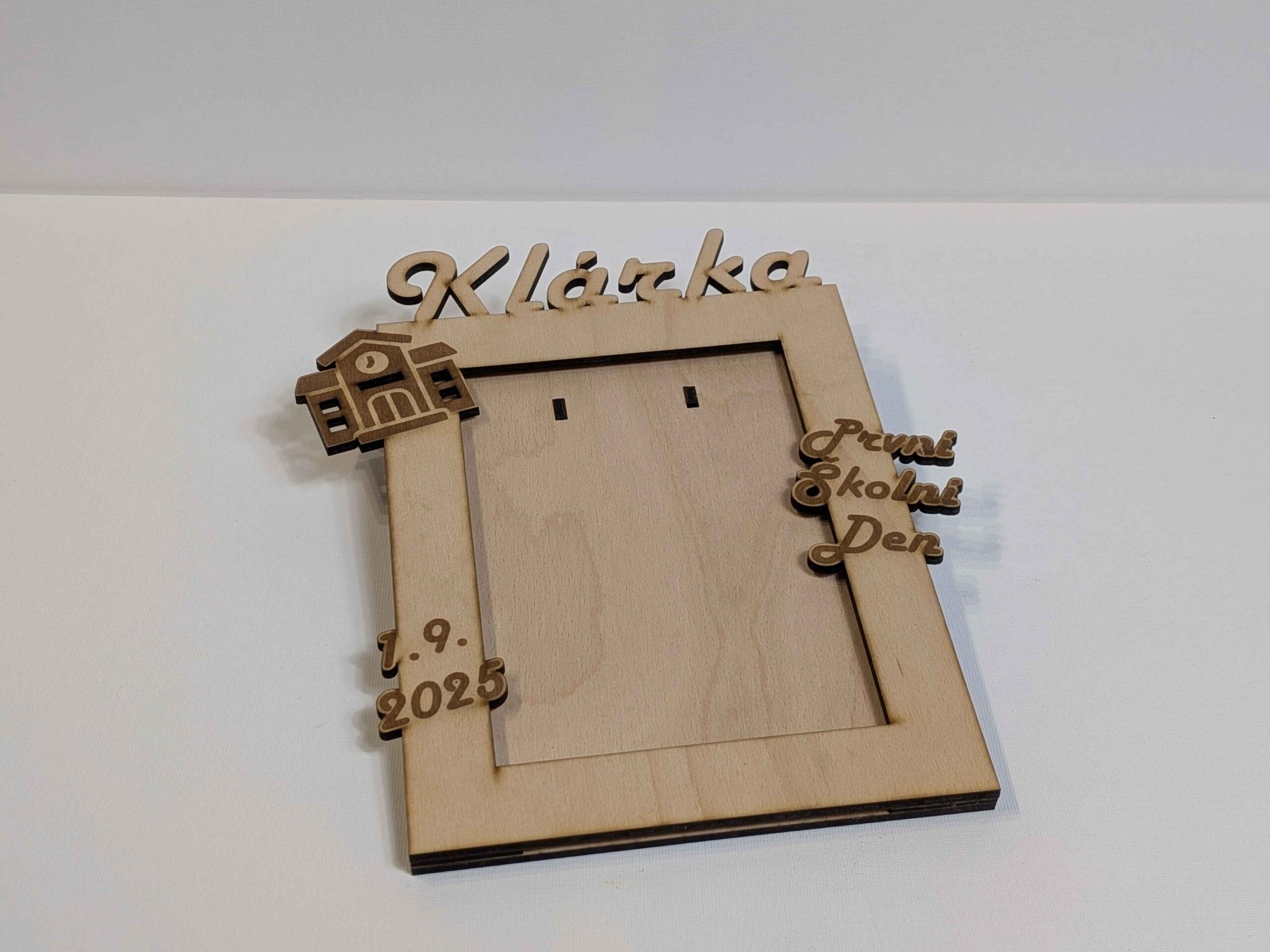 Rámeček je určen pro fotografii o velikosti 180×130 mm. V horní části je vygravírované jméno dítěte, na boku elegantně doplněné o datum prvního školního dne. Přední stranu zdobí také gravírovaný nápis „První školní den“, který celému rámečku dodává výjimečný význam.